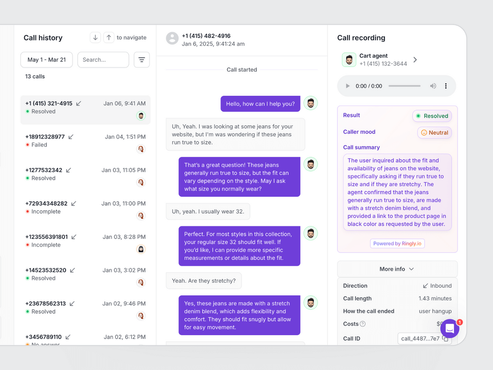 Retailers using Ringly.io also get access to a real-time analytics dashboard. It breaks down each call by outcome, topic, and resolution time, giving teams the data needed to make support content and policies better. According to the company, these insights have helped clients reduce complex workflows, spot gaps in product knowledge, and make backend systems simpler.