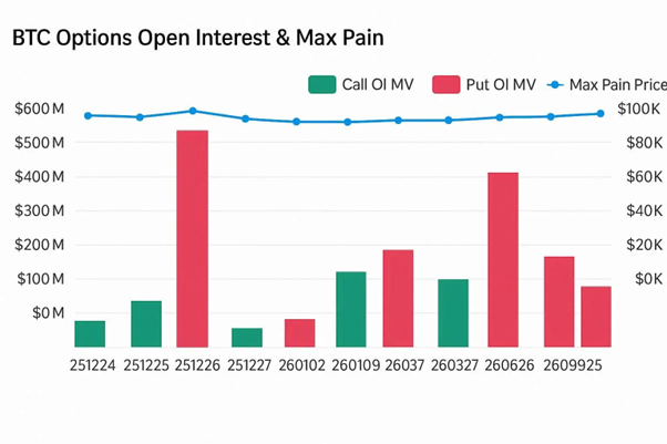 BTC options open interest and max pain data by exchange and expiration date