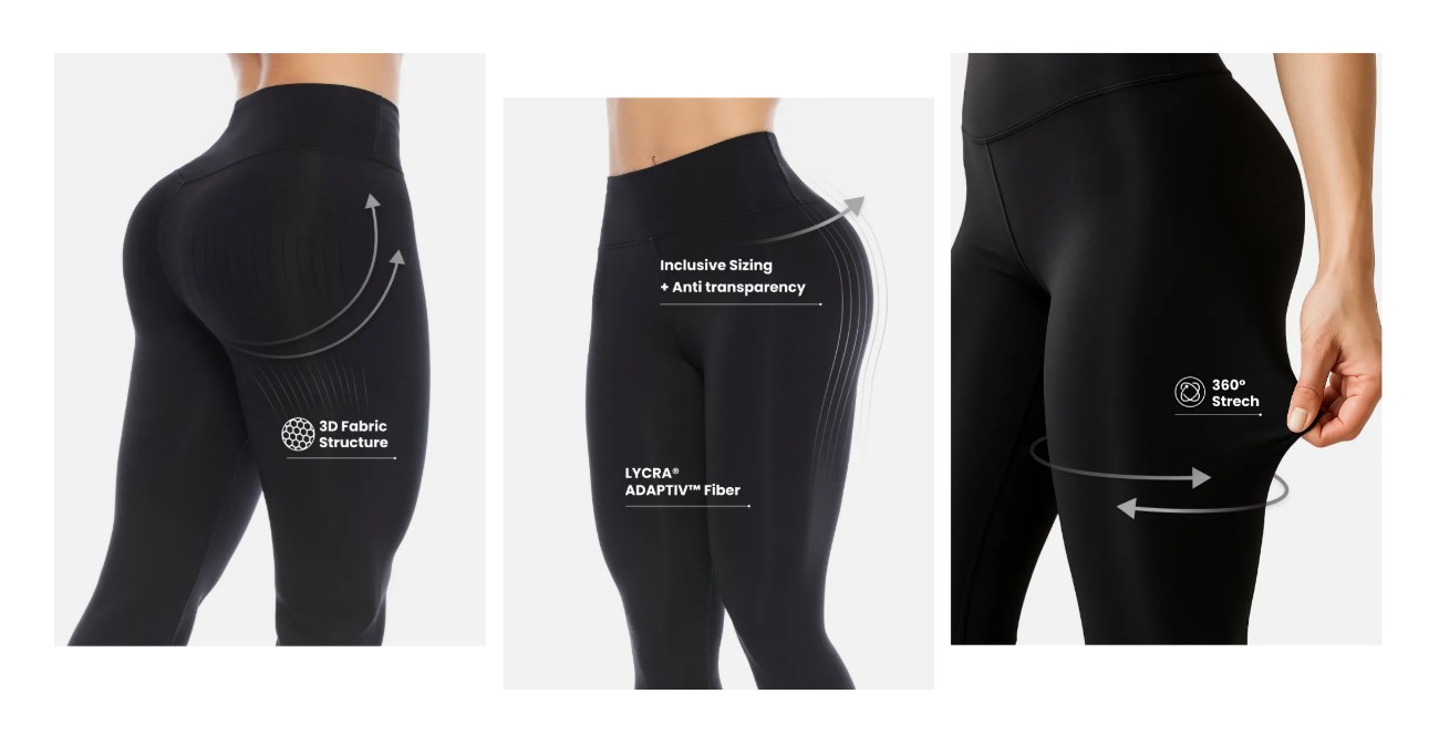 While other leggings stretch, Curvy Leggings adapt to the wearer’s body, staying in place all day. Experience full freedom of movement, with a 360-degree stretch in all directions. Workout confidently, with a breathable design that remains comfortable no matter how active the day gets. The fabric’s technical 3D knit creates a high-density design that prevents the leggings from becoming transparent, potentially showing a woman’s undergarments.