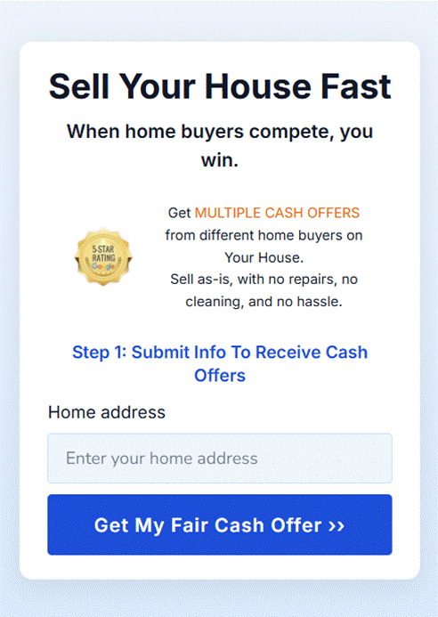 1. Fill out a quick form — Go to HouseGoodbye.com and answer a few simple questions about the home. No agents or no appointments are required.