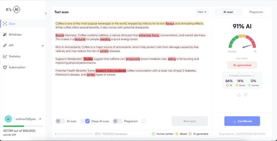 It’s AI, the most accurate AI detector according to the RAID benchmark, has announced a major update to its platform. The new feature provides word-level AI highlights, giving users deeper insights into how detection results are calculated and what exactly words impacted AI score the most.