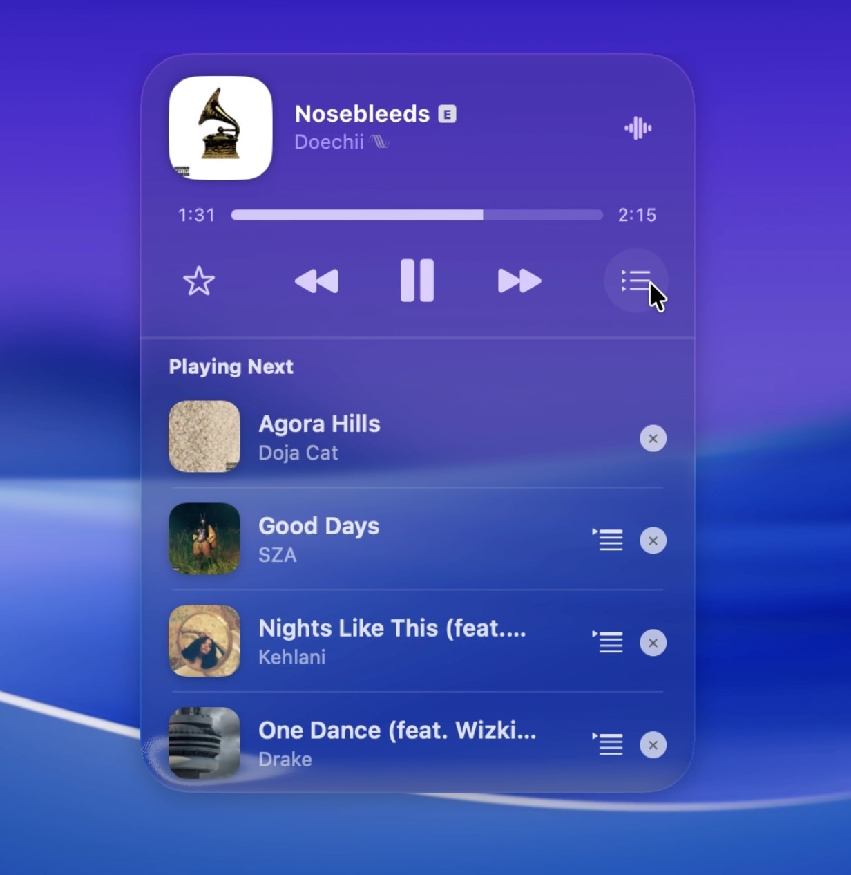 The miniplayer provides quick access to essential playback controls, including play, pause, skip, and volume adjustment. As an Apple Music miniplayer for Mac, Liqoria supports key features such as the Apple Music queue, search, playlists, AirPlay, and lyrics.