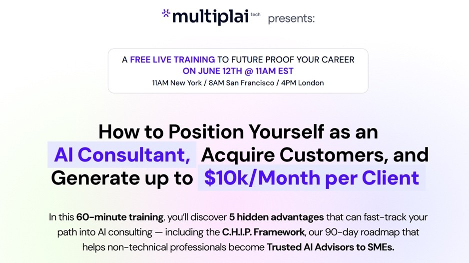 Cebu, Philippines — Multiplai Tech, a pioneer in AI-powered business transformation, has announced a strategic training session for professionals wanting to enter the AI consulting sector. The session is titled “How to Position Yourself as an AI Consultant, Acquire Clients, and Earn up to $10K/Month per client” and will be delivered live at no cost to attendees.