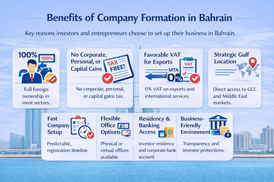 Operating from its office in the Diplomatic Area of Manama, Setup in Bahrain specializes in company formation in Bahrain for foreign-owned businesses, offering a fully compliant, end-to-end solution that covers commercial registration, investor visas, corporate bank account setup, and ongoing regulatory support. As an approved business centre in Bahrain under the Ministry of Industry, Commerce & Tourism (MOICT), the company provides investors with a reliable, government-recognized pathway to establish a legal presence in the country.