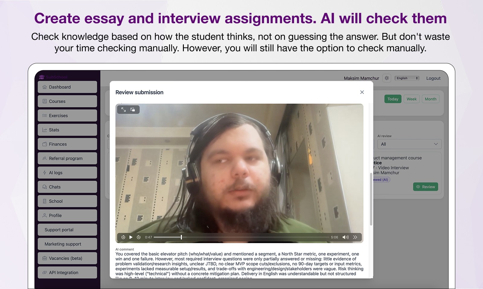 SubSchool’s AI features extend beyond generating assignments. The platform supports automated checking for multiple formats, including written work and video-based answers, with educators able to review and adjust results before finalizing feedback. This workflow is intended to help scale feedback while maintaining instructor oversight, so teachers can spend less time on repetitive checking and more time on explaining, guiding, and improving outcomes.
