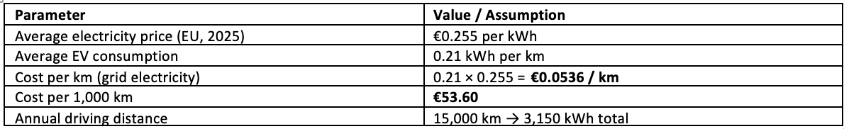 Real-world EV consumption averages approximately 0.21 kWh per km. Based on the EU’s average grid electricity price of €0.255 per kWh, the cost equates to €0.0536 per km, or €53.60 per 1,000 km. Over 15,000 km of annual driving, this totals 3,150 kWh. A solar-integrated smart charging system that supplies 60% of this energy would save approximately €482 per year compared with full grid reliance.